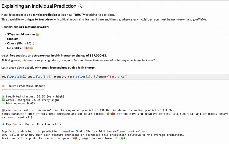 On-the-fly report generation to explain and compare predictions in plain language along with state-of-the-art visualization tools like Accumulated Local Effects Plots and SHAP Waterfall Plots, among others.